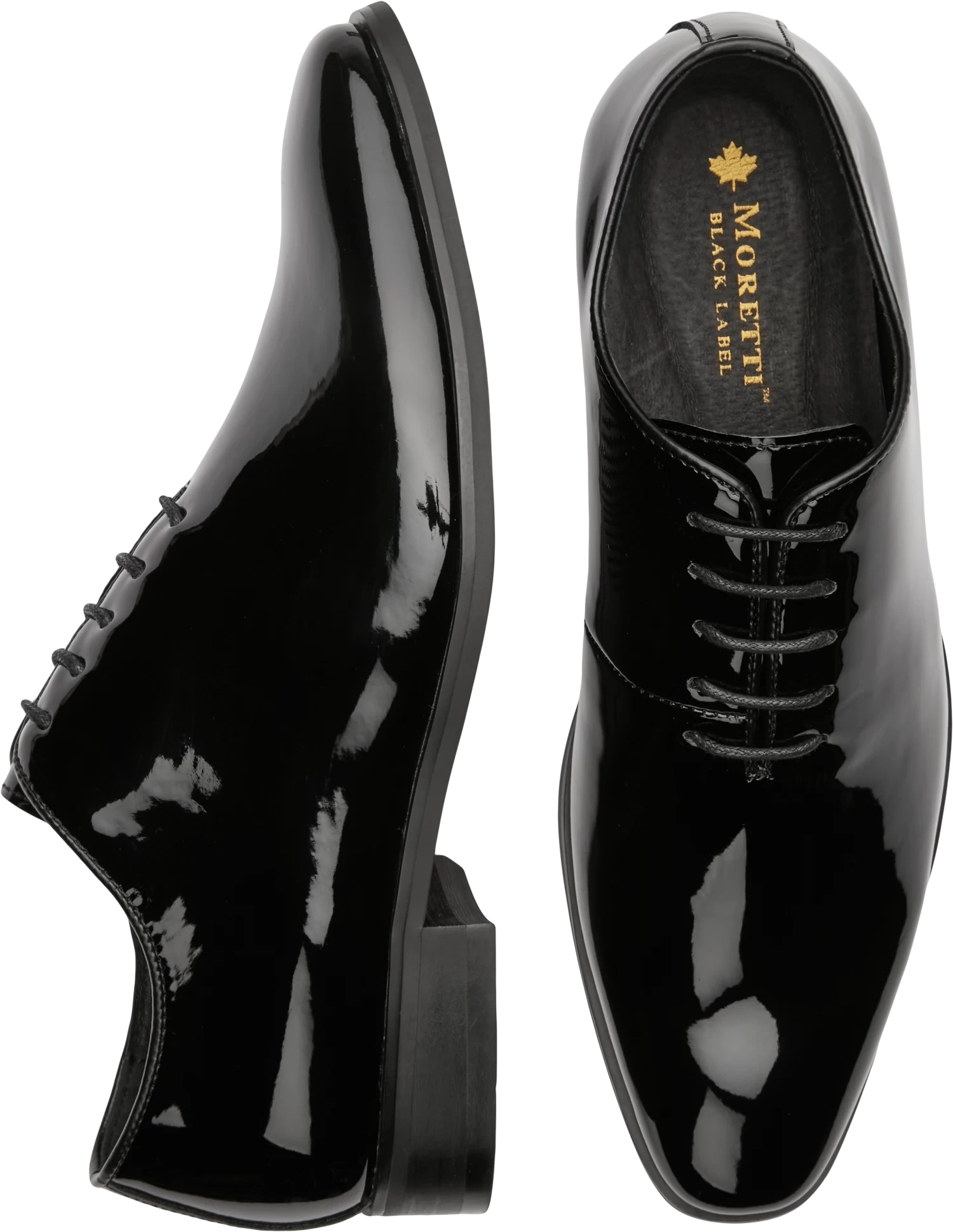 Look your best at your next formal event in the comfort and style of Moretti shoes. These lace-ups feature smooth patent finish uppers with plain toes.